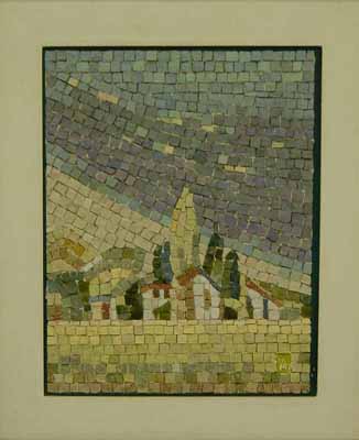 粘土に顔料を練りこんで焼き上げたタイルを細かく割って作り上げたものです